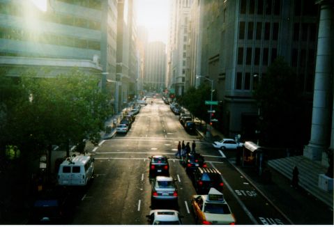 So sieht's hier manchmal abends aus, wen ich von der Arbeit zur Ubahn hetze. die Abendsonne spiegelt sich in den Fenstern der Wolkenkratzern und bereitet ein unwirklich aussehendes Lichterspiel auf der Strasse. Man, I love this city!