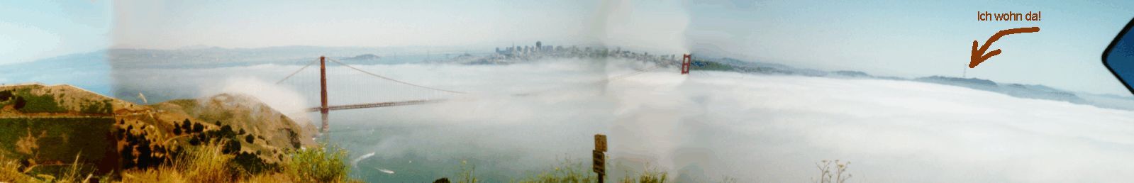 Vor ein paar Wochen hab ich mir mal am Sonntag Lynns Motorroller geschnappt und bin ueber die golden Gate Bridge nach Marine Headlands geduesst. Von dort aus hat man ne riessige aussicht ueber das Golde Gate zurueck nach San Francisco. An diessem Nachmittag hatte San Francisco ziemlich haeftigen Fog. Fog ist ein Phaenomen das in dieser form eigentlich nur hier in der Bay Area auftritt. An Sonnigen Tagen erhitzt sich die Luft in der Bay und steigt nach oben. Dadurch wird ein Vakuum erzeugt, dass den ganzen in Kuestennaehe aufsteigenden Wasserdampf nach innnen in die Bay zieht. Auf diese Weisse Laufen die San Franciscaner fast den ganzen Sommer im Nebel rum. (Fog). Der Fog hat aber auch seine Positive Seite: In San Francisco wird's niemals brechend heiss - wie im uebrigen Californien. San Francisco wird 'die Stadt mit natuerlicherKlimaanlage' genannt. Die meisten Hauesser hier haben keine Klimaanlage, was fuer die Vereinigten Staaten sehr ungewoehnlich ist. Sie brauchen einfach keine. Hier herrschen immer angenehme Temperaturen. Von hier oben Sieht das ganze aus, wie als wuerde man auf Wolken laufen - einfach cool! Das Bild hab ich aus vier Fotografien zusammengesetzt und mit Corel Photopaint ein bischen verpfuscht. Es lebe die Bildbearbeitung. Ach ja: Scroll doch mal kurz nach rechts. Dort hab ich markiert wo ich so ungefaehr wohne.